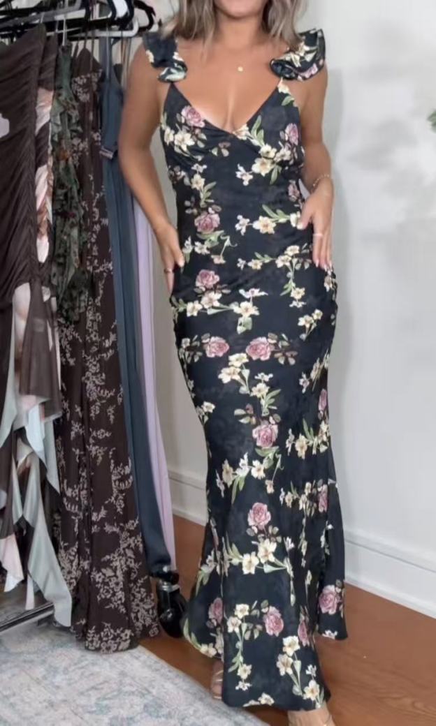 Style Information and Care: A sweet V-neckline frames the collarbone. Adjustable ruffled camisole straps add a playful, feminine touch. The open design features a dramatic cowl drape. The sleek camisole silhouette offers a slightly curvaceous silhouette. Luxurious floral jacquard fabric features an intricate woven texture. Concealed side zipper closure. Lining Style Exterior and Lining: 100% polyester. Hand wash in cold water with matching colors, no bleach, and line dry.