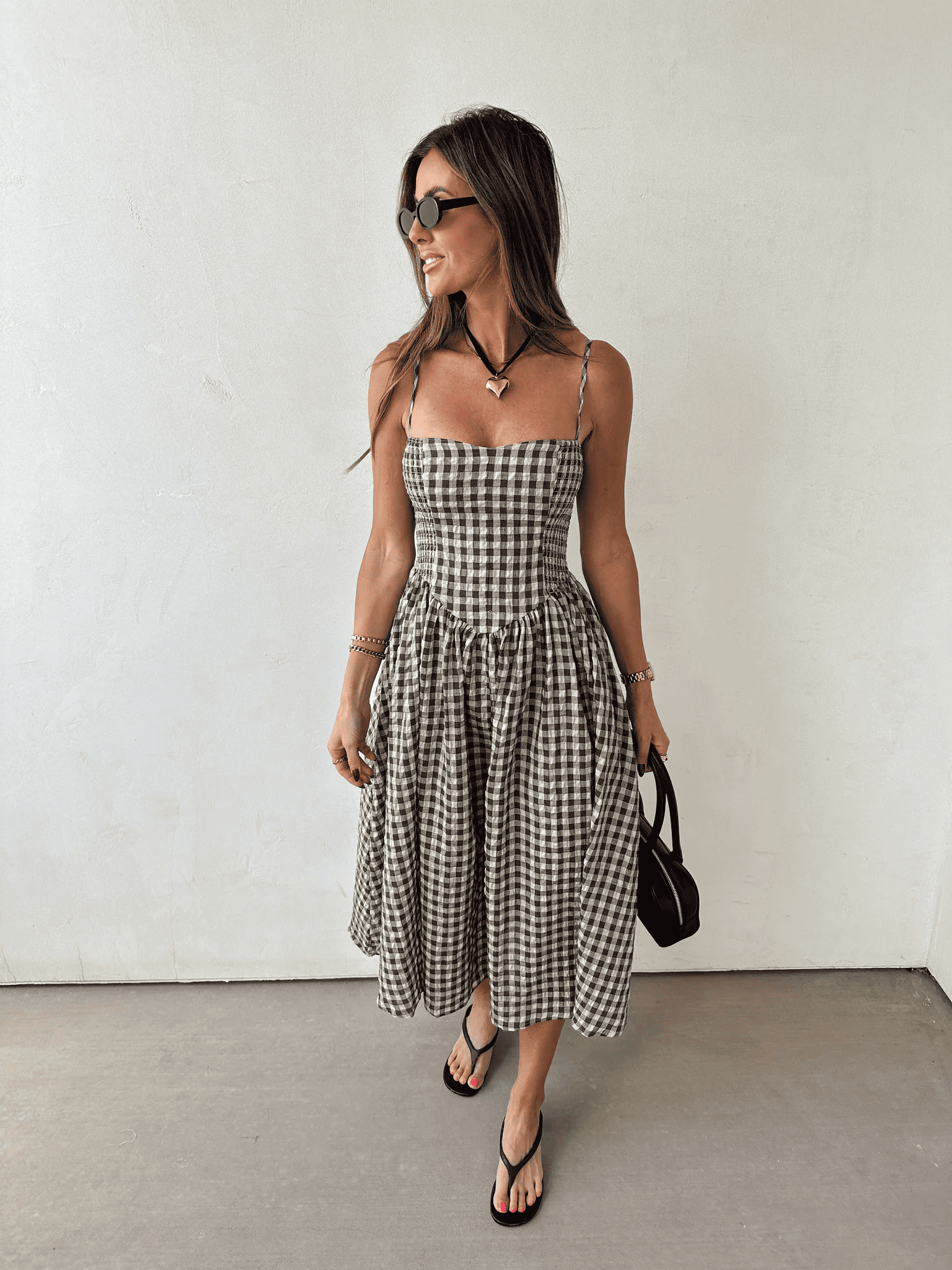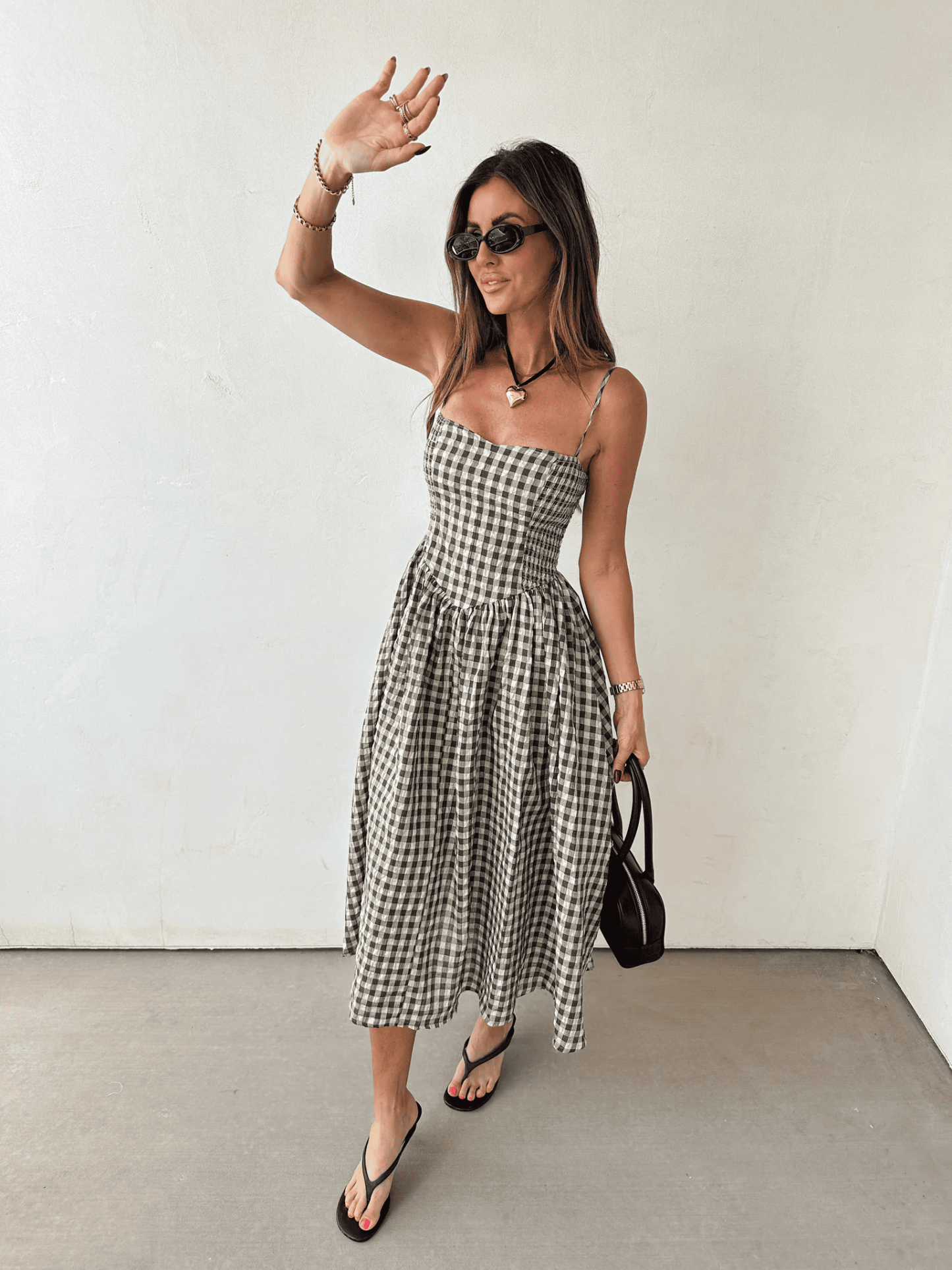 Effortless and timeless, this sleeveless midi dress with shrunken sleeves is the perfect blend of casual allure and chic comfort. The natural plaid print adds a playful yet classic touch, while the shrunken bodice creates a flattering fit. Easy to wear, easy to love, this is a dress you'll reach for again and again. Lightweight fabric with a natural plaid print Gathered bodice for a stretchy, flattering fit Sleeveless design with a relaxed midi length Flowy silhouette that moves with you Perfect for warm days, layering, or casual outings Model measurements: Height: 5'8", Bra: 32C, Denim: 26 (non-stretch), typically wears a size small Item measurements: Size Small: 32" chest (with stretch panels), 41.5" length Material: 50% polyester, 50% cotton