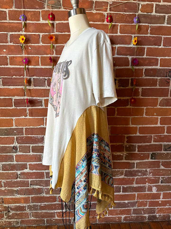 Upcycled flowy detail side top Chest: 21 inches wide, lying flat, armpit to armpit Length: 28-42 inches from shoulder to hem Cotton poly rayon Hand wash gently, or machine wash separately and air dry