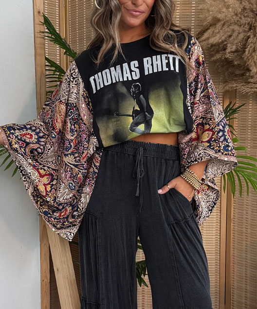 Details One of a kind! Not restocked! Washed vintage graphic T-shirt with batwing sleeves Material: 50% cotton/50% recycled blend Back patch may vary* Sizing One size fits most Model wears size OS Model Measurements Size: 4 Height: 5'2" Weight: 135 lbs Chest: 34" Waist: 27" Hip: 36"