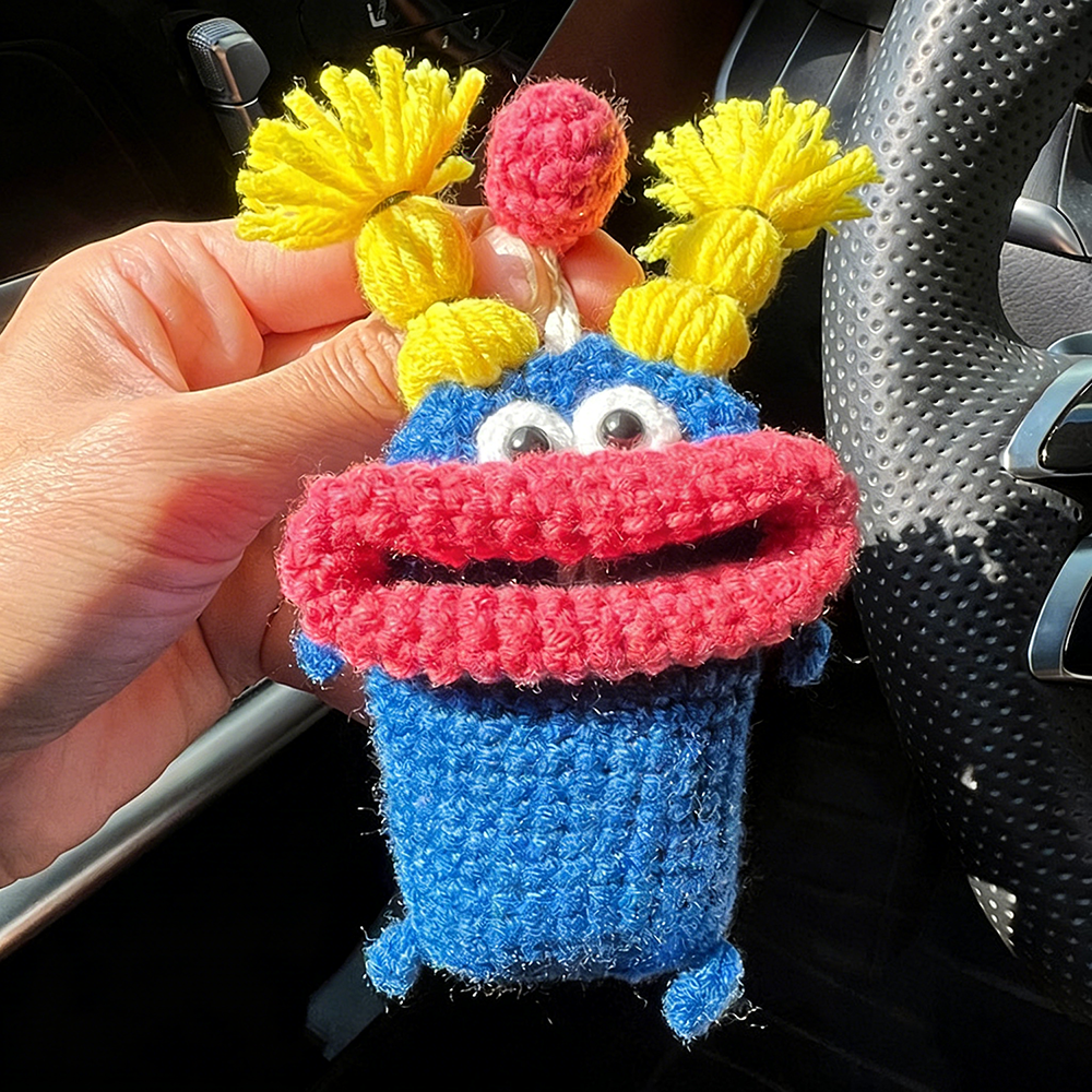A delightfully chaotic and eye-catching accessory, this hand-crocheted key case reimagines the iconic "sausage mouth" character as a playful clown. Crafted from soft, durable cotton yarn in a bold mix of royal blue, vibrant red, and sunny yellow, it features an oversized grinning red mouth, googly 3D eyes, and a wild "hairdo" of yellow pom-poms and a pink topknot. The compact, stretchy pouch keeps keys secure and scratch-free, while the lightweight design makes it easy to tuck into a bag or attach to a backpack for a pop of fun.