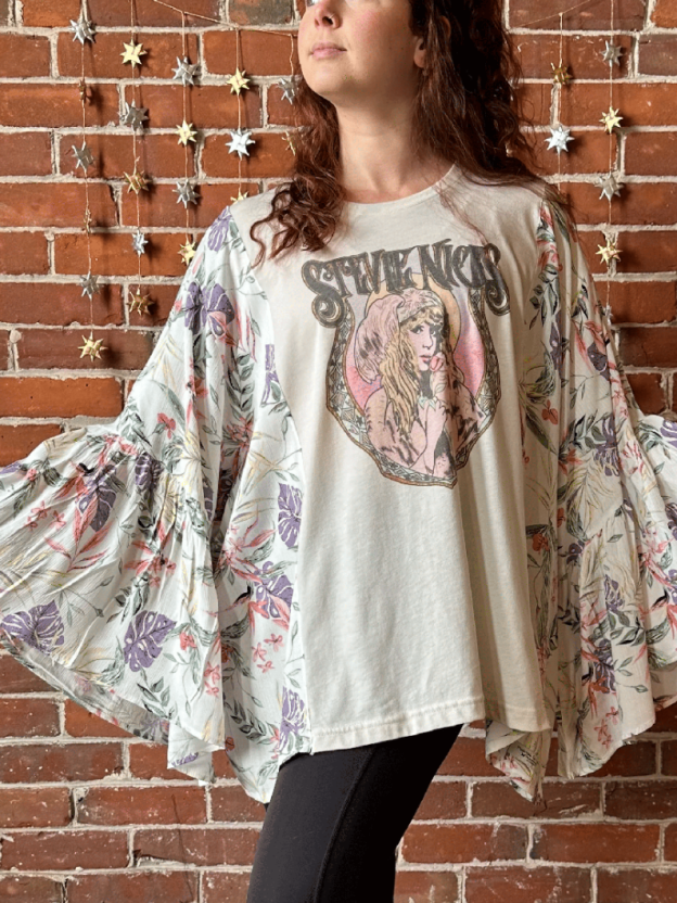 Made from an upcycled Stevie Nicks T-shirt, this T-shirt features soft, flowing, botanical-print bell sleeves, making it a must-have for any Fleetwood fan. Perfect for concerts or everyday wear. Sizes 0-24 Length: 27 inches Chest measurement up to approximately 50 inches Armhole: approximately 24 inches Cotton and polyester blend Spot clean or hand wash gently, air dry
