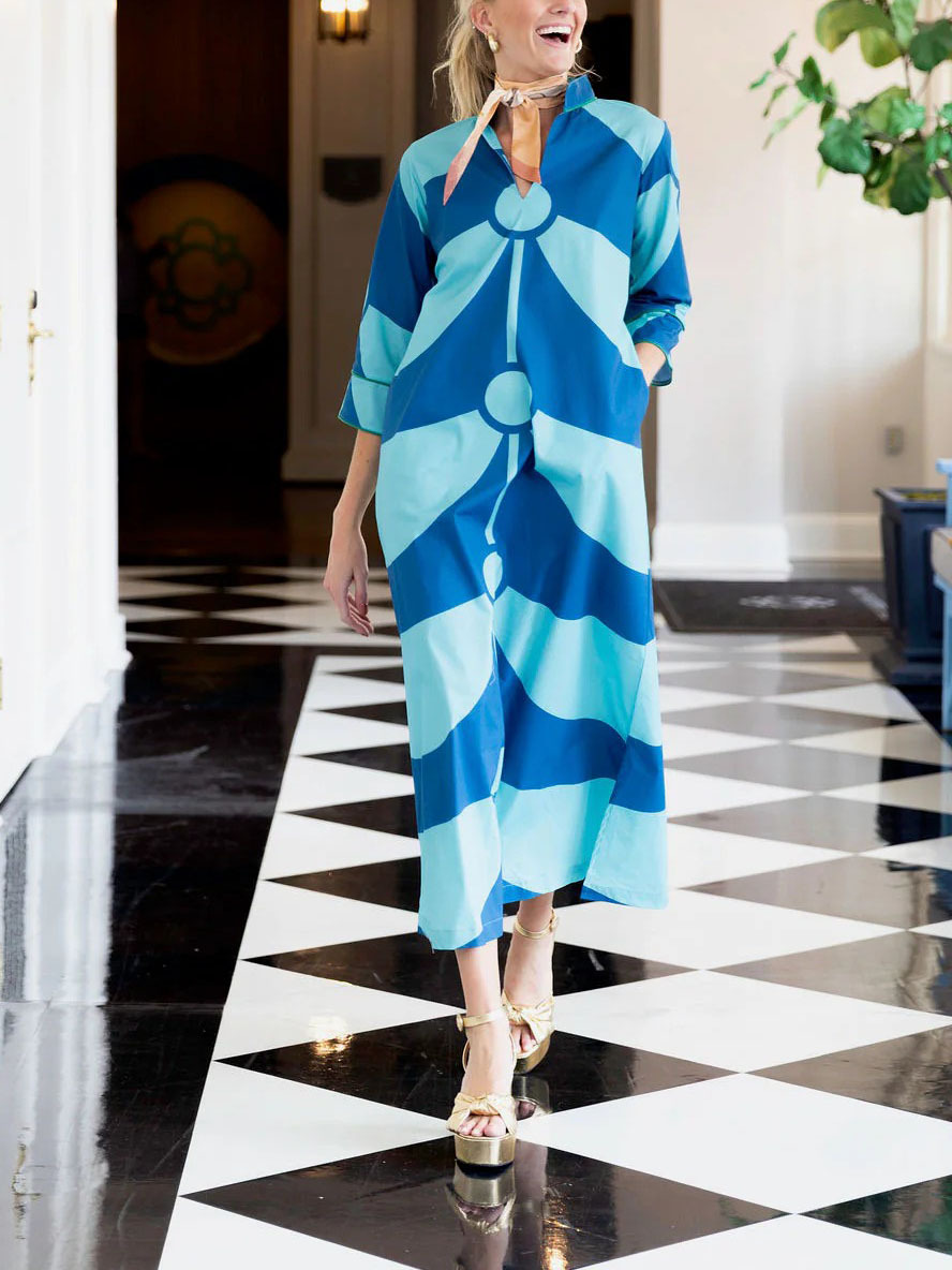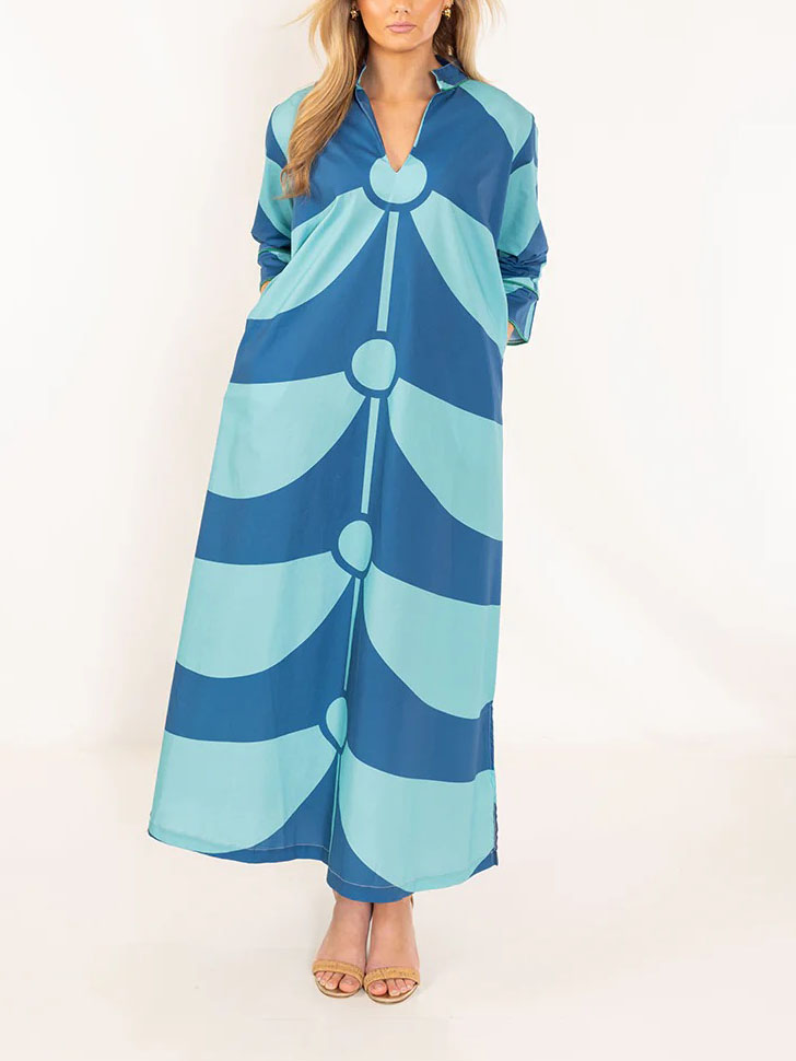 • Design: Relaxed maxi shirt dress; two-tone blue geometric wave print; stand collar; three-quarter sleeves; button-front placket; side slits