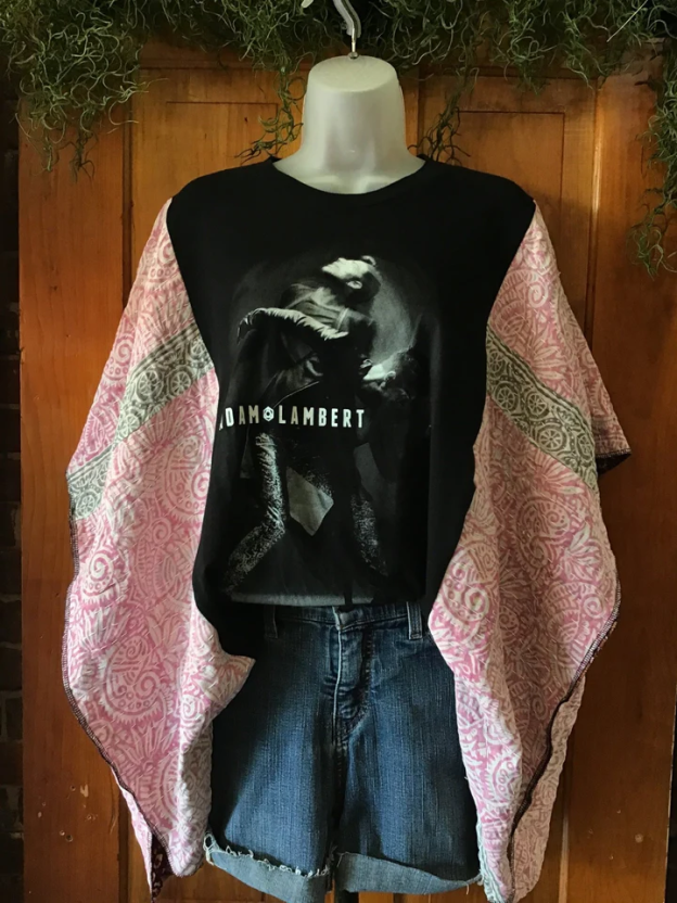 Upgrade your wardrobe with this unique upcycled Adam Lambert band t-shirt, now an eco-friendly kantha poncho perfect for concerts or everyday wear. This versatile piece pairs perfectly with jeans or shorts, allowing you to express your unique style... We consider our ponchos "one size fits all"—a comfortable 2X fit! When laid flat, this top measures: Armpit to armpit (chest): 35 inches Breadth from shoulder to bottom (this is the kantha fabric panel): 26.5 inches Neckline to bottom seam: 23 inches