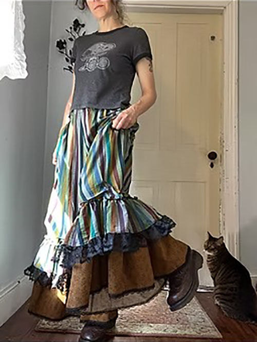 Super awesome fall stripe cotton with a golden brown floral flared tiered ruffle!! So much fabric, with extra ruffly ruffles, lace trim, side pockets, elastic waist, comfy fit! Super swishy like a skirt!
