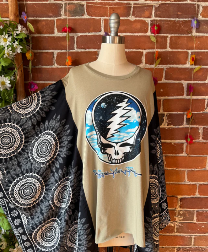 Description This item is one of a kind and made with love right here at our studio in New Hampshire One Size Fits Most Upcycled top and flowy tie dye fabric on the sides Ready to ship. 48” wide laying flat side to side at the bust Length: 29” shoulder to hem Cotton/poly/rayon hand wash gently, or machine wash alone delicate, Air Dry Please take a moment to look over all shop policies before purchasing.