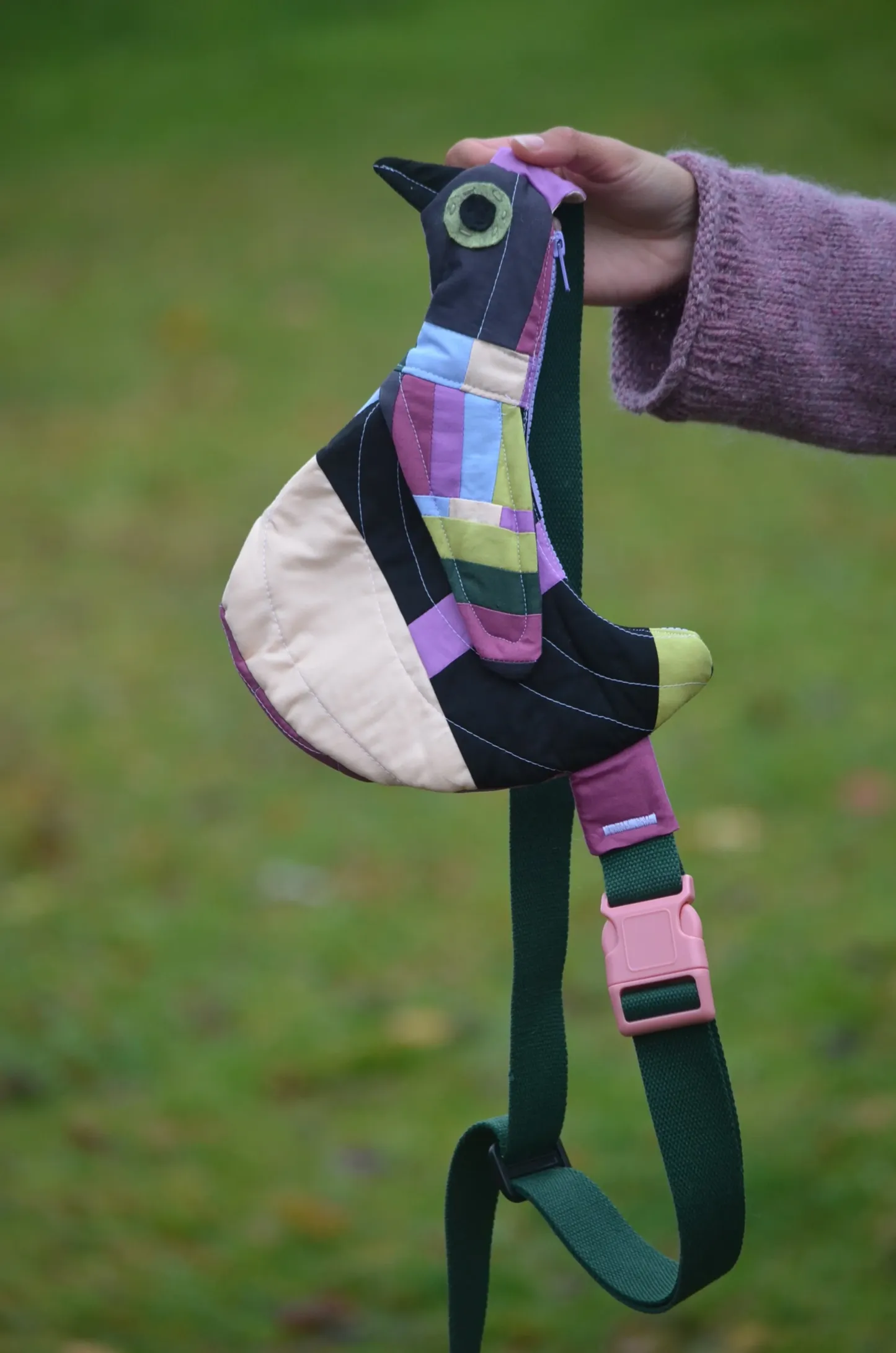 The Fly Away Crossbody is a sling bag shaped like a bird! This is a completely handmade bird bag that will quickly become your go-to crossbody. Besides the adorable bird front, it has a mosaic of colorful fabric and notions for the interior, strap, zipper, and back side. The bag can be worn like a sling or a shoulder bag, and the strap is fully adjustable. Gorgeously soft quilted bag made from 100% cotton fabric and batting100% cotton strap with high-quality plastic buckles and zipperFully-lined interiorBag faces the right side of the body while you’re wearing it. It features a front designed to resemble a patterned duck, with black, mauve, peach, green, and blue coloring. The bag interior pictured here is just an example; the interior colors of each bag vary. Hand-wash with water and gentle soap only.