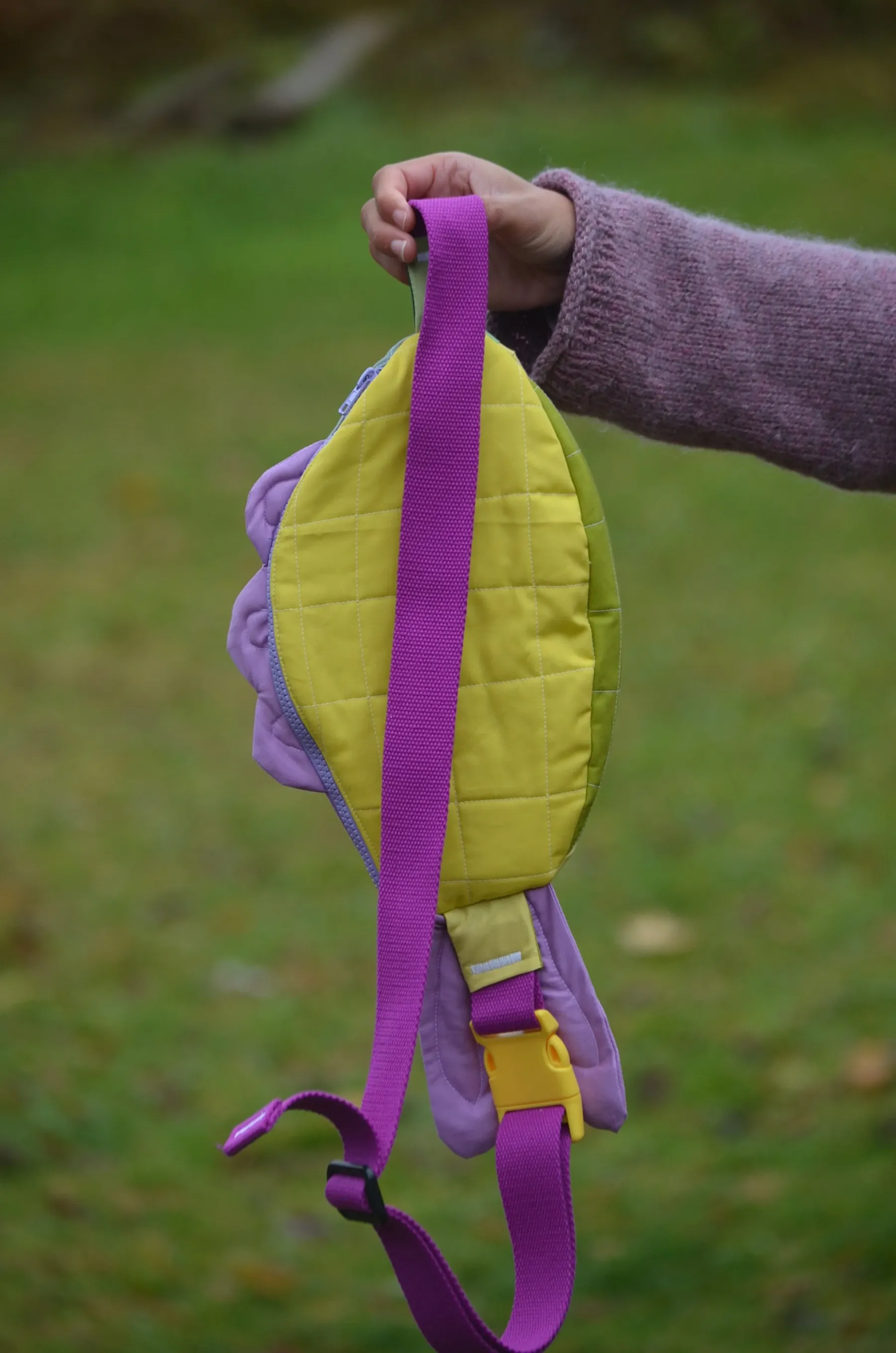 The Swim Along Crossbody is a sling bag shaped like a friendly fish! This is a completely handmade fish bag that will quickly become your go-to crossbody. Besides the adorable fish front, it has a mosaic of colorful fabric and notions for the interior, strap, zipper, and back side. The bag can be worn like a sling, a shoulder bag, or a fanny pack, and the strap is fully adjustable. Gorgeously soft quilted bag made from 100% cotton fabric and batting100% cotton strap with high-quality plastic buckles and zipperFully-lined interiorBag faces the right side of the body while you’re wearing it. It features a purple and green body. The fins and strap are purple. The bag interior pictured here is just an example; the interior colors of each bag vary. Hand-wash with water and gentle soap only.