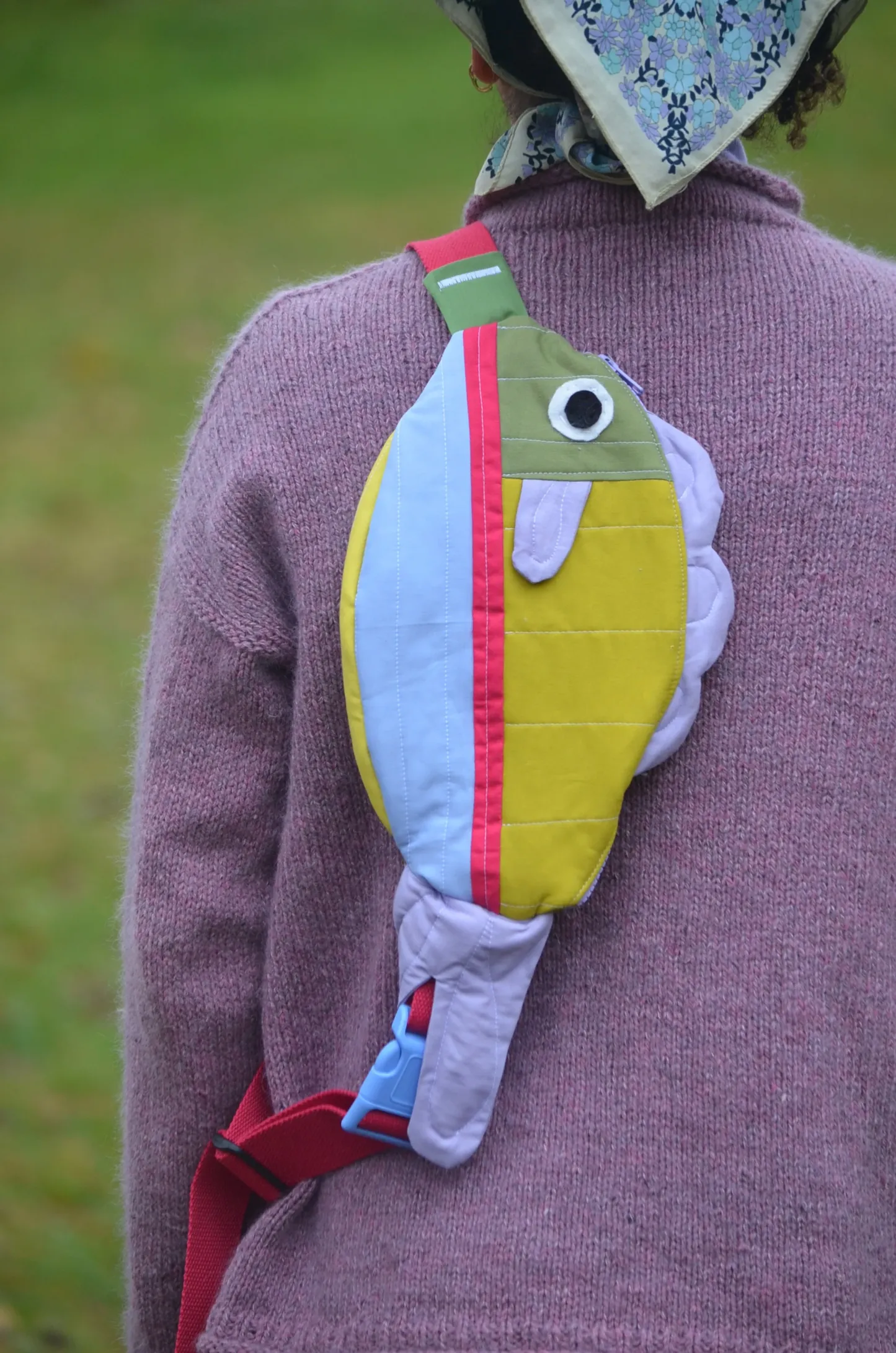 The Swim Along Crossbody is a sling bag shaped like a friendly fish! This is a completely handmade fish bag that will quickly become your go-to crossbody. Besides the adorable fish front, it has a mosaic of colorful fabric and notions for the interior, strap, zipper, and back side. The bag can be worn like a sling, a shoulder bag, or a fanny pack, and the strap is fully adjustable. Gorgeously soft quilted bag made from 100% cotton fabric and batting100% cotton strap with high-quality plastic buckles and zipperFully-lined interiorBag faces the right side of the body while you’re wearing it. It features a green, pink, and blue body. The fins are lavender, and the strap is pink. The bag interior pictured here is just an example; the interior colors of each bag vary. Hand-wash with water and gentle soap only.