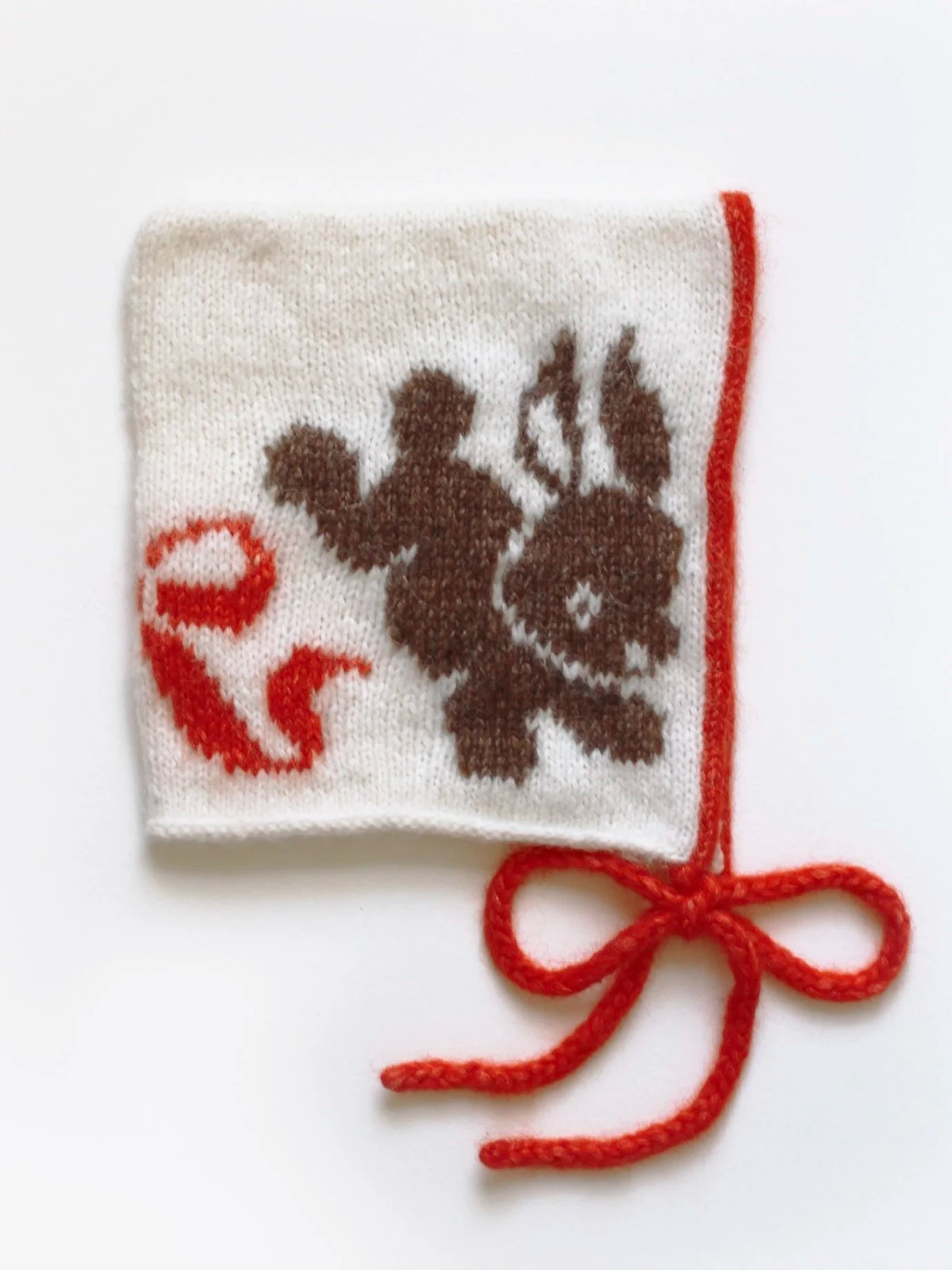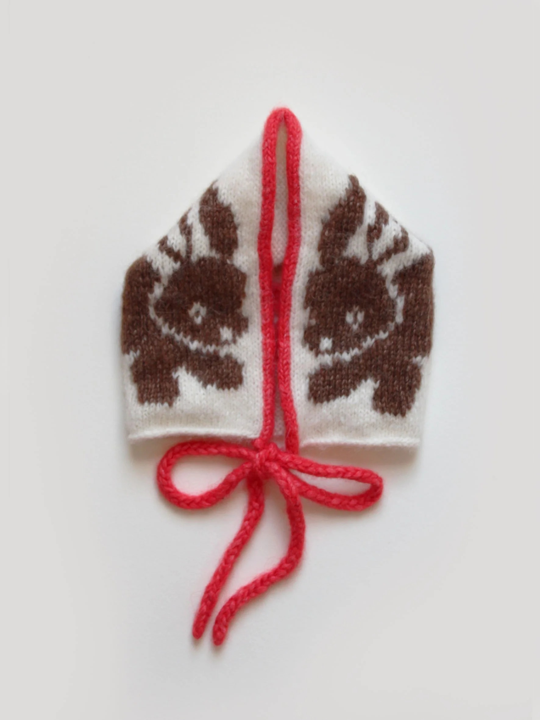 Hand-knitted Bunny Lou square bonnet in white, brown and red