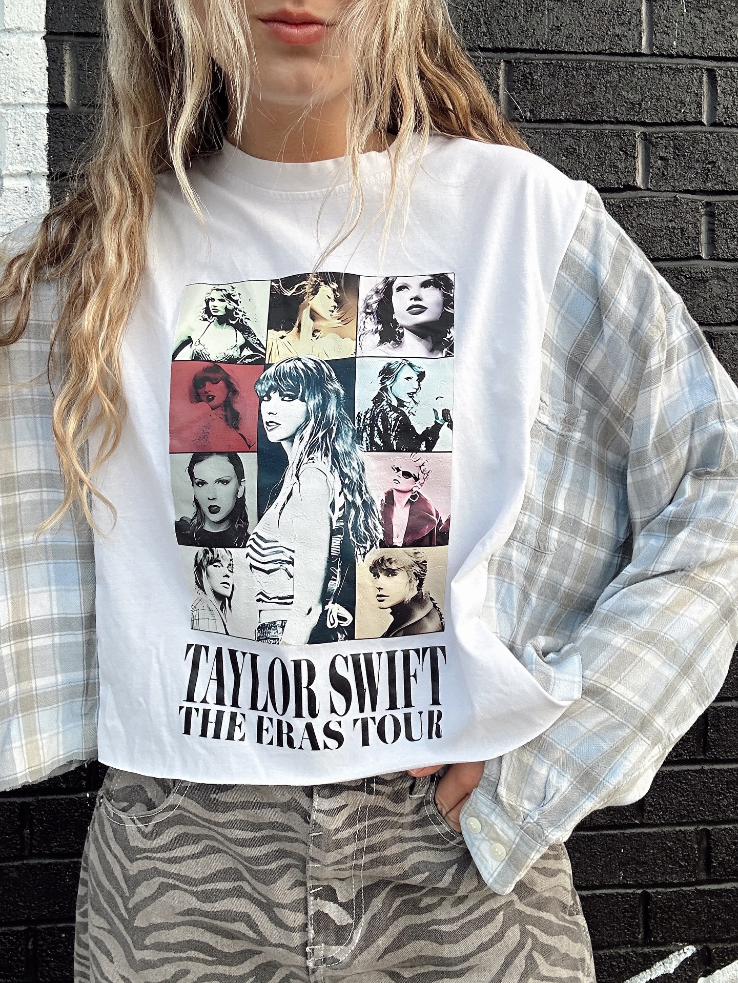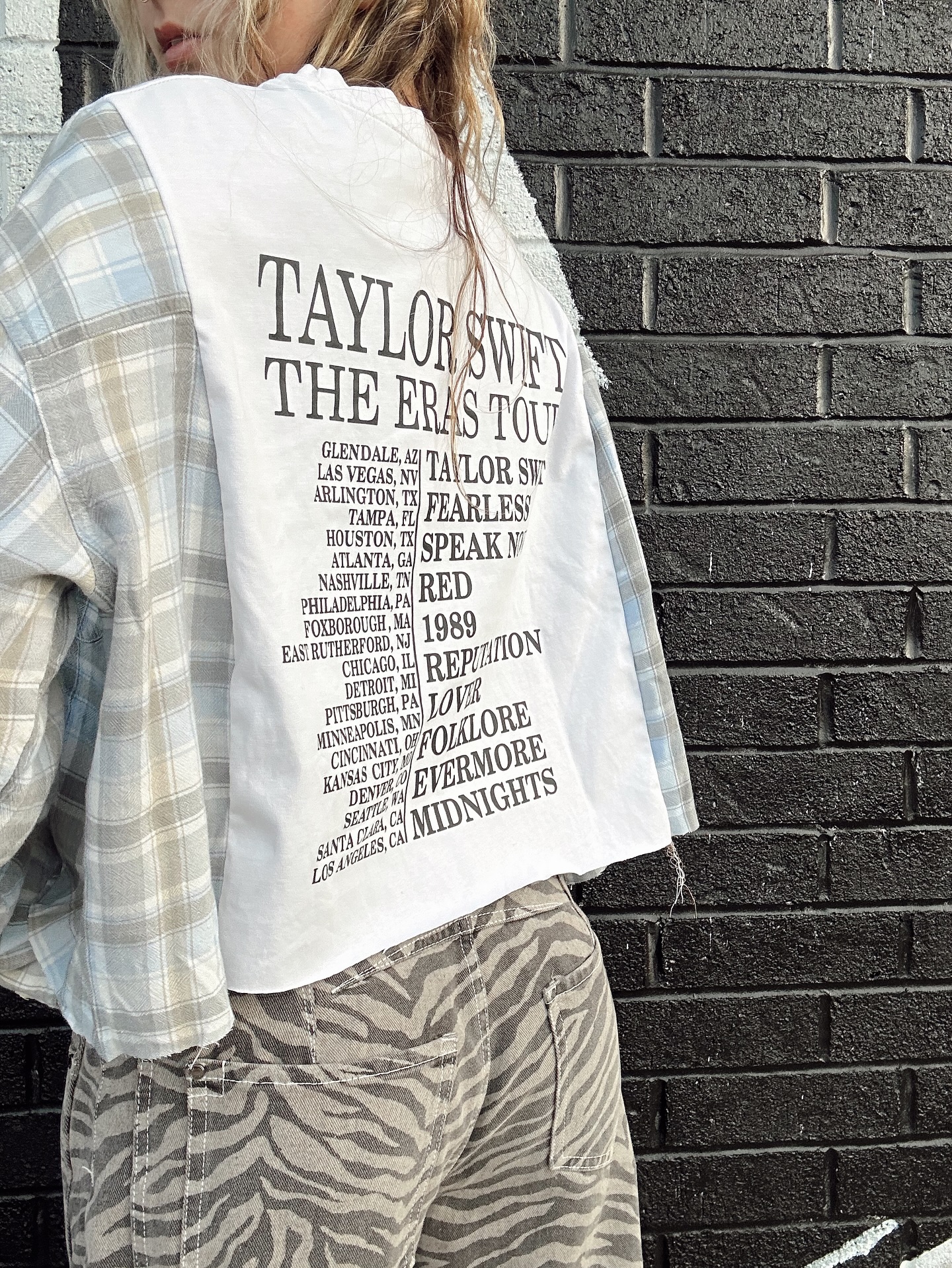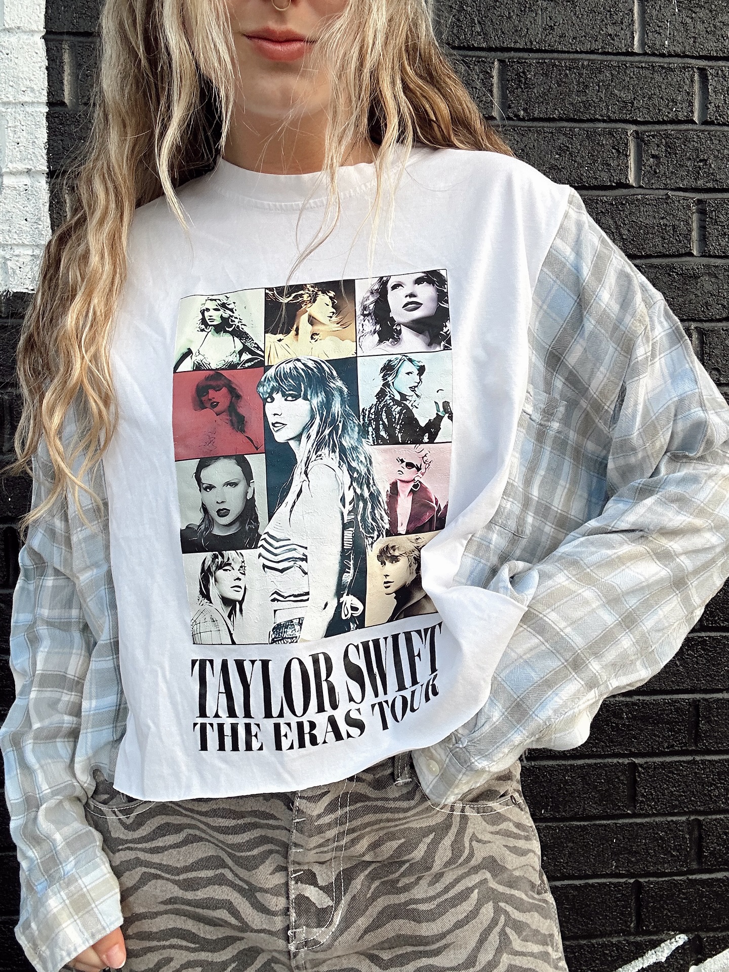 T-shirt + open-sleeve flannel. Vintage/pre-owned soft men's flannel fabric.