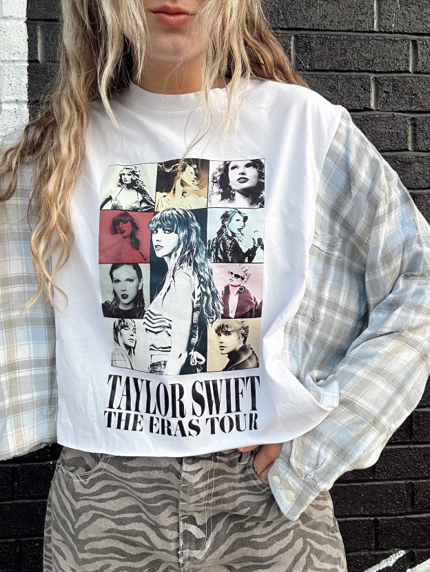This t-shirt is slightly cropped... the bottom hem has been cut off, creating a raw edge.
