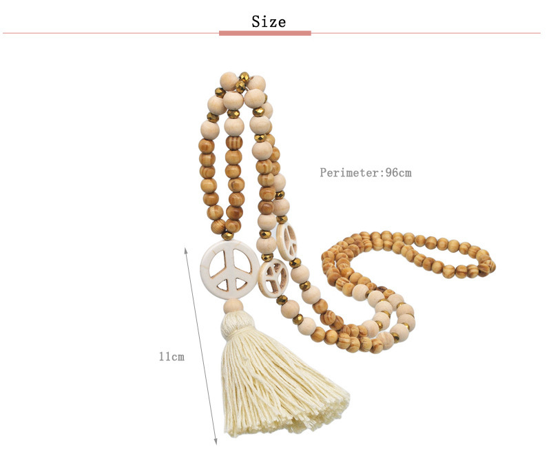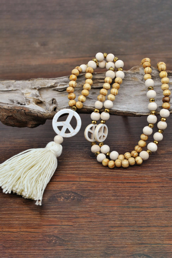 Handmade Wooden Beads with Fringe and Peace Pendant, Long Necklace