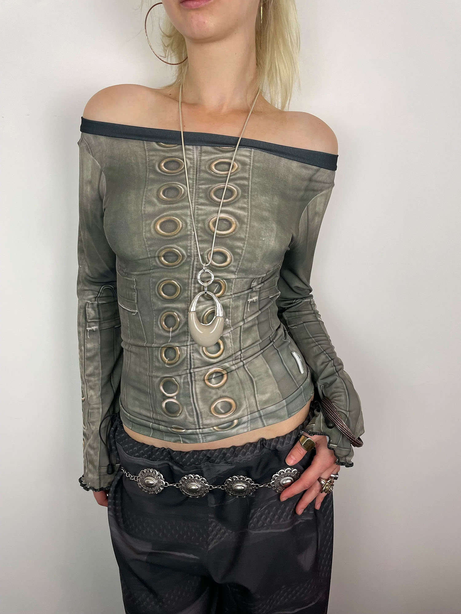 This top leans into timeless vintage flair—featuring a textured utility-inspired metal-ring print (in muted olive tones), off-shoulder neckline, and sheer mesh long sleeves for subtle edge. Crafted from stretchy soft fabric, it has a cropped silhouette that hugs the torso, perfect for layering with high-waisted bottoms. Ideal for vintage-themed outings, casual hangs, or eclectic everyday fits.