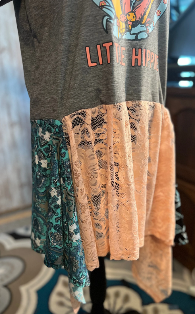 One of a Kind, Stay Trippy Little Hippie, Mushrooms, Boho, Upcycled, Thrifted and reworked by me, Peach color lace, 70's, Hippie